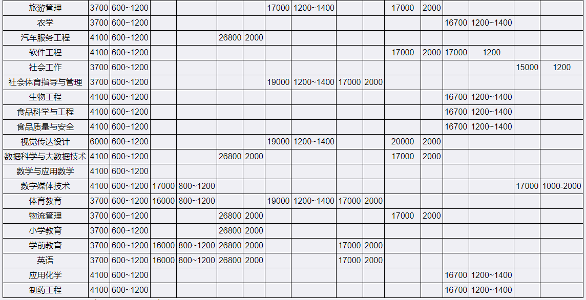 备注:①宜宾学院本校住宿费根据宿舍条件不同分别有600元/年.人、700元/年.人、800元/年.人、1000元/年.人、1200元/年.人等五个标准;②绵阳城市学院住宿费有800元/年.人和1200元/年.人两个标准;③成都文理学院、四川工业科技学院、四川外国语大学成都学院住宿费有1200元/年.人和1400元/年.人两个标准。